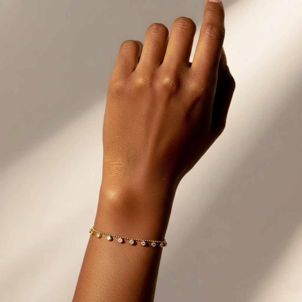 The Glimmer bracelet is an exquisite dance of light and elegance. Delicate golden beads form a graceful chain, from which tiny, brilliant zircons descend like morning dew. This piece is designed to catch every ray of light, adding a subtle yet captivating sparkle to your wrist. Perfect for layering or as a stand-alone statement of understated luxury.